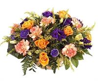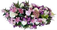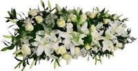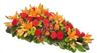 Photo non contractuelle | Raquette de fleurs / Dessus de Cercueil - Taille L Raquette de fleurs de saison agrémentée d'un généreux feuillage, de forme allongée pour un dessus de cercueil -