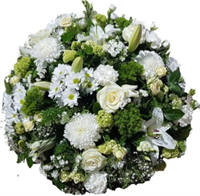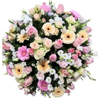 Photo non contractuelle | Gerbe piquée - Taille M Elégante gerbe piquée mousse à base de fleurs précieuses et de saison -Taille M : 70 / 75 cm - Ruban inclus avec 50 caractères max -