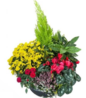 Photo non contractuelle | Jardin de Plantes Fleuries - Taille S Jardin de plantes de saison en terre : 3 à 4 plantes vertes et fleuries en Corbeille Osier -