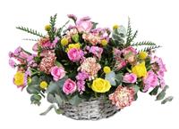 Photo non contractuelle | Panier Hommage - Taille L Composition de fleurs de saison ronde piquées en mousse dans une corbeille en osier -