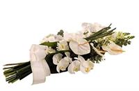 Photo non contractuelle | Raquette de fleurs / Dessus de Cercueil - Taille M Raquette de fleurs de saison agrémentée d'un généreux feuillage, de forme allongée pour un dessus de cercueil -